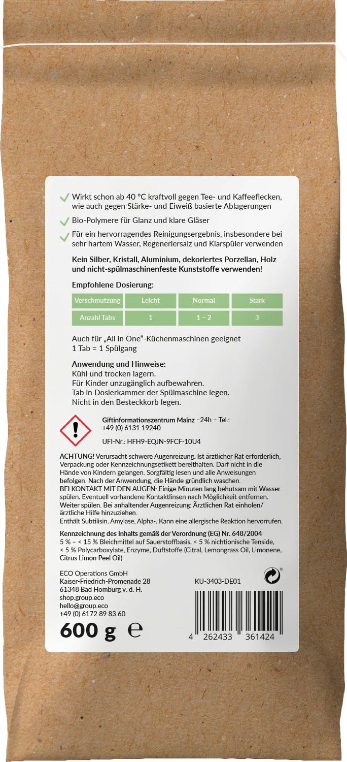 Die Geschirrtabs in der kompakten Größe werden auf Basis von natürlichen Inhaltsstoffen formuliert und bieten in konzentrierter Form dieselbe Reinigungsleistung von großen Tabs, bei weniger Platzverbrauch im Schrank. Außerdem sind sie in Papier verpackt und kommen gänzlich ohne PVA-Folie aus. Für strahlend sauberes Geschirr - auch bei hartnäckiger Verschmutzung.
