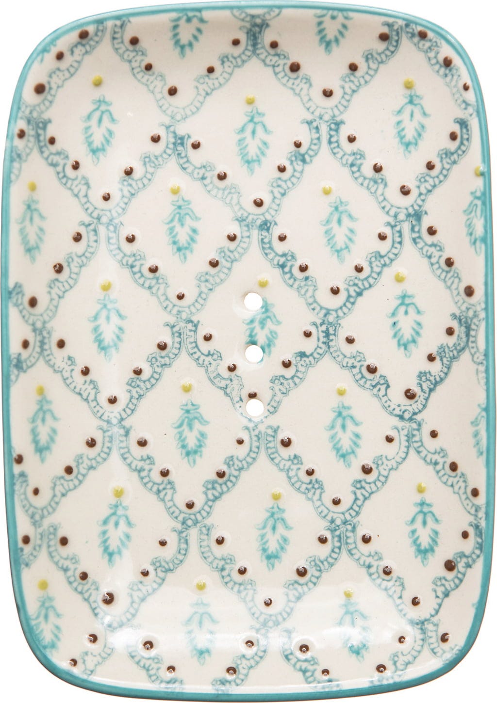 Die rechteckige Grundform mit den abgerundeten Ecken, der zarte, handgestempelte Print und die Ablauflöcher, um Wasser abrinnen zu lassen, machen diese Seifenschale zu einem Must-Have für dein Bad! Ihr filigranes Design in zarten Farben macht sie zu einem Hingucker und verleiht eine individuelle Note.